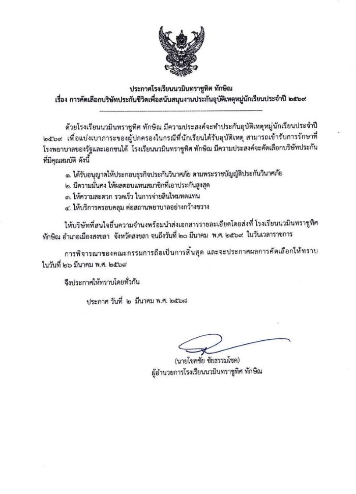 - ประกาศ คัดเลือกบริษัทประกันชีวิต เพื่อสนับสนุนงานประกันอุบัติเหตุหมู่นักเรียนประจำปี ๒๕๖๙ |