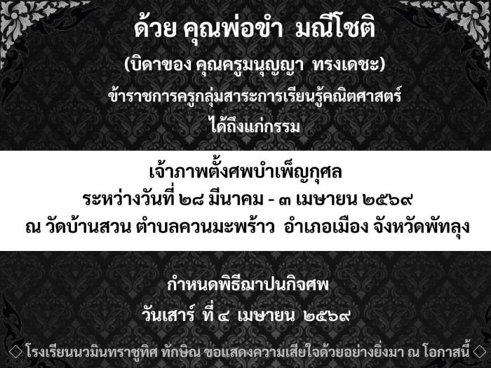 - ขอแสดงความเสียใจอย่างสุดซึ้งกับครอบครัวนายอนันต์ ผุดเกตุ อดีตท่านรองผู้อำนวยการโรงเรียนนวมินทราชูทิศ ทักษิณ และผู้อำนวยการโรงเรียนวรนารีเฉลิม