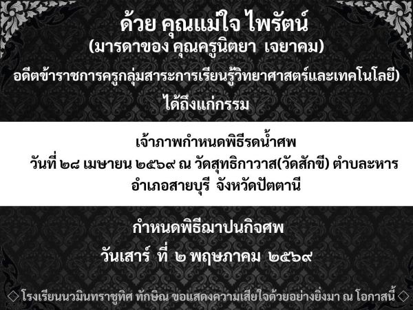 - ขอแสดงความเสียใจอย่างสุดซึ้งกับครอบครัวอดีตคุณครูนิตยา เจยาคม