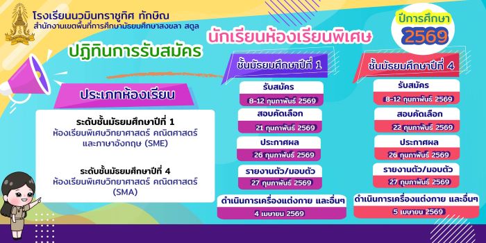 และห้องเรียนพิเศษด้านวิทยาศาสตร์ คณิตศาสตร์ (SMA) ชั้น ม.4 ประจําปีการศึกษา 2569 |